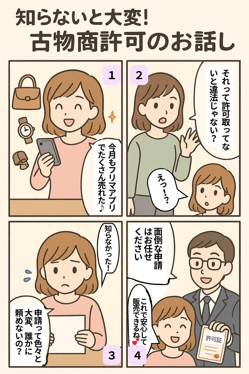 店頭での販売だけでなく、フリマアプリやヤフオク等、オンラインで継続的に販売する場合には、古物商許可が必要です。副業や個人事業でも例外ではありません。