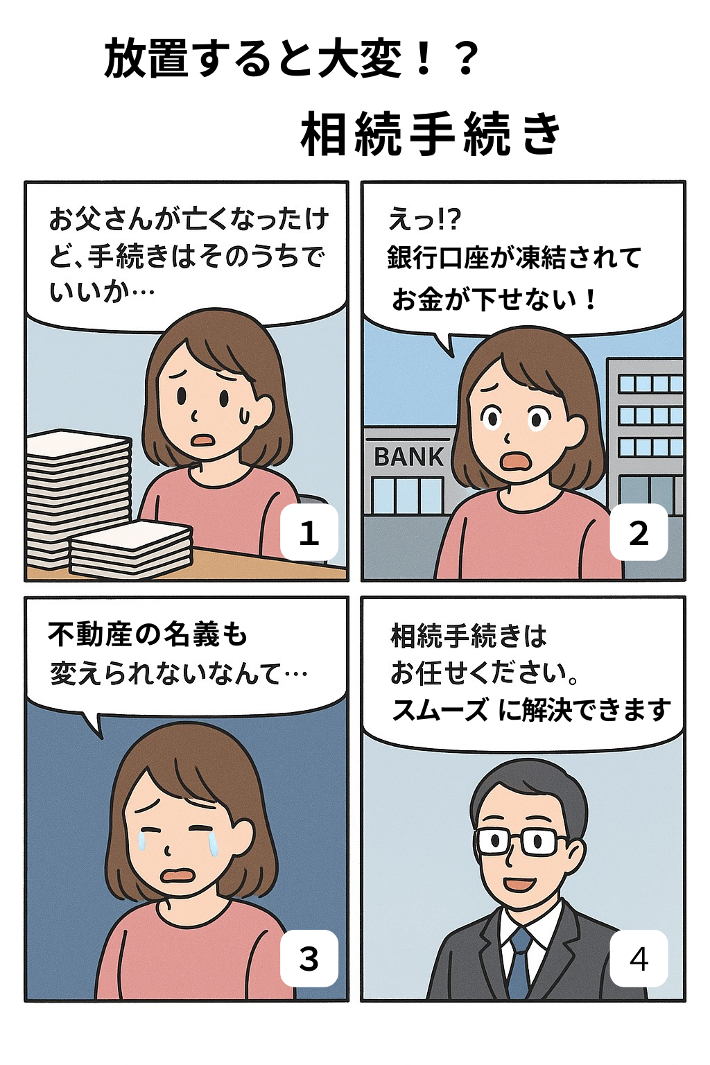 相続手続きは、まだ大丈夫と先延ばしにしていると、増々大変で複雑になってしまいます。また、期限がある手続きや、相続放棄をしないと高額な負債を抱えてしまうケースも考えられます。早目に手続きをして解決しておくことが重要です。