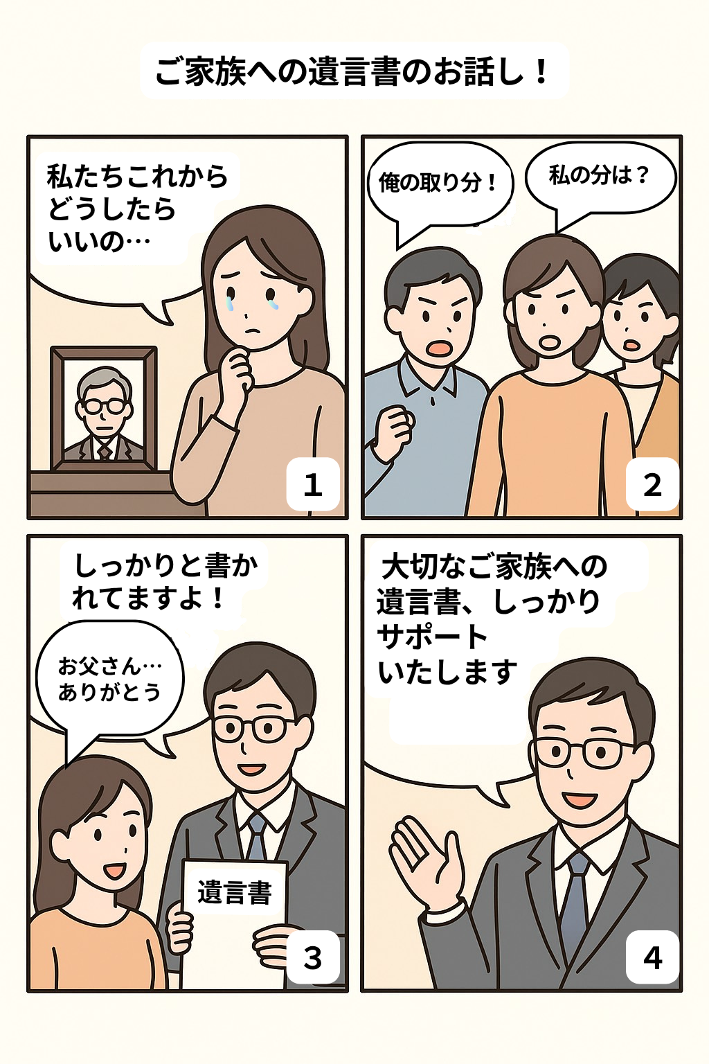 遺言書は自分の思いを大切なご家族に伝えるための優しさです。そして、ご遺族様が次に進むための目印にもなります。後の相続トラブルを未然に防ぐために、ご家族が明るく暮らせる未来のために、生前から遺言書を作成しておく事がとても大切です。また、相続人がいない高齢者や子供のいないご夫婦こそ、遺言書を作成しておく必要性があります。